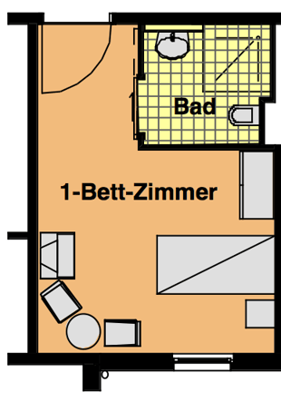 Das Einzelzimmer hat eine großzügige Grundausstattung. Es verfügt über eine Raumgröße von 18,00 m² und ein rollstuhlgerechtes Bad mit einer Raumgröße von 4,7 m².