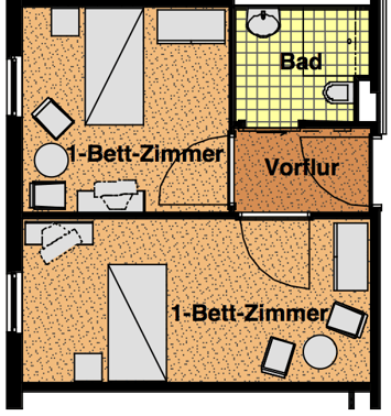 Die Dublette ist eine gute Alternative zum Einzelzimmer. Sie eignet sich gut für Ehepaare oder Freundinnen oder Freunde, die einen unterschiedlichen Pflegebedarf haben. Zwei Einzelzimmer teilen sich ein Bad und sind über einen kleinen eigenen Flur miteinander verbunden.