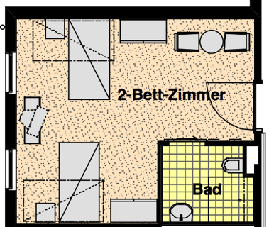 Das Zweibettzimmer hat eine großzügige Grundausstattung. Es verfügt über eine Raumgröße von 27,55 m². Zum Zweibettzimmer gehört ein rollstuhlgerechtes Bad mit einer Raumgröße von 4,59 m².